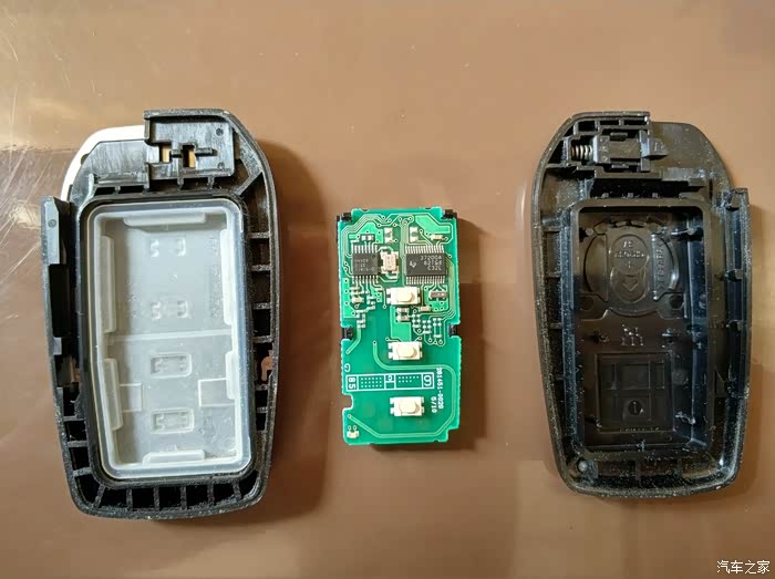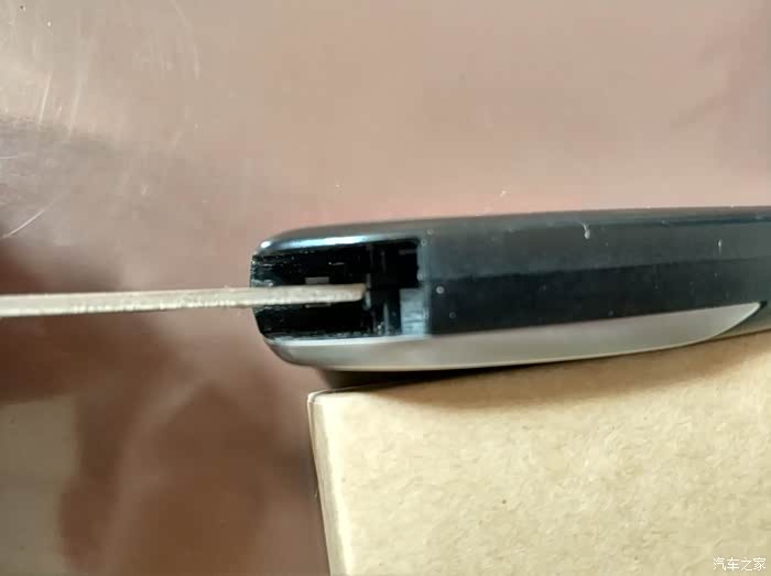 卡片钥匙没多少部件,换电池比较简单。用手指捏住电池盖的边缘,上下晃几次松开卡扣,然后稍用力一拔就打开了。