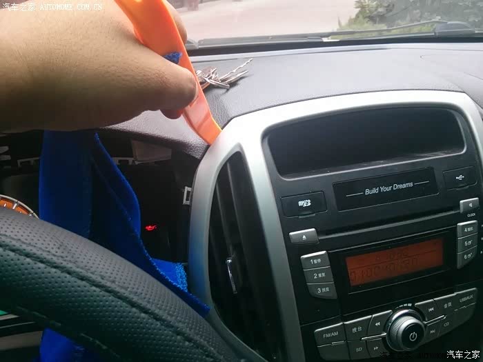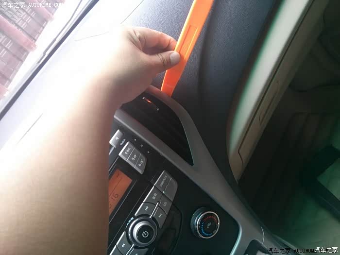 然后就开始拆原车中控屏,用胶刀撬开中控屏附近的装饰面板,从上往下撬,胶刀上最好用毛巾包裹一下,防止弄坏面板,在撬的时候多注意卡扣,别把卡扣撬坏了,如下图所示: