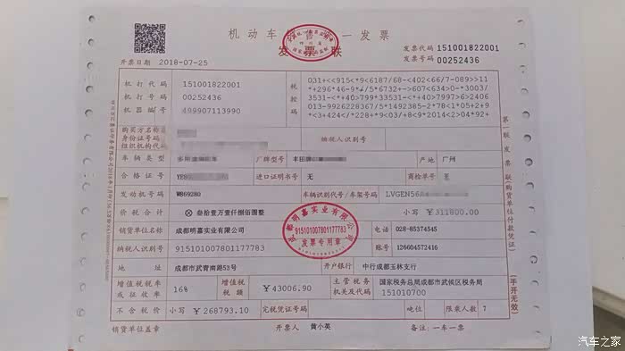 回到家才发现。7月21日又转了一万大洋给销售(大家都不容易不能让他倒贴)。购车发票又寄回去重新开。