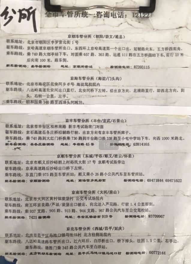27号上午去取档案,在市局二楼最左侧办公台,他们是八点半办公,取完了档案,直奔盛华检测场,因为大厅的工作人员给了一张表,上边写着几个检测场,见下图,问工作人员花乡能测吧,他爱答不理的,也不说清,哎这些同志,没一个是脸好看的,看来反四风反的还不够,后来通过网上查才发现其他检测场也行,比如通州西潞苑小区附近的通州检测场也可以,花乡的7421,当然如果这些检测场离家近,最好还是去问一下比较好。附上网上再通州检测场的攻略不过是13年的,http://bbs.bato.cn/thread-5561531-1-1.html,这里面说的撕前挡膜不知道啥意思,反正我在京顺没有让撕,不过如果你主副驾驶旁边的玻璃是全被膜贴着的话那肯定不行,要拿刀把反光镜那一块的膜割下来,自己弄或者去外边修理场。还有这个http://blog.sina.com.cn/s/blog_877f5cf10102ybxt.html,大家参考。 7421检测场是https://club.autohome.com.cn/bbs/thread/1f9ddc8b4d0ee76c/15941635-1.html。