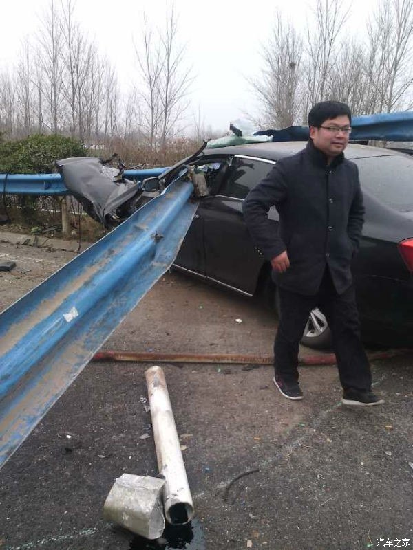 神奇的一幕出现了,这就是我,把身边的钢管和满身的杂物整理了一下从驾驶室出来。看见没有,衣服都没破一点啊。此时的心态根本没想到那么严重,只知道这次撞得厉害。车上还有3位我的至亲,也毫发未损。