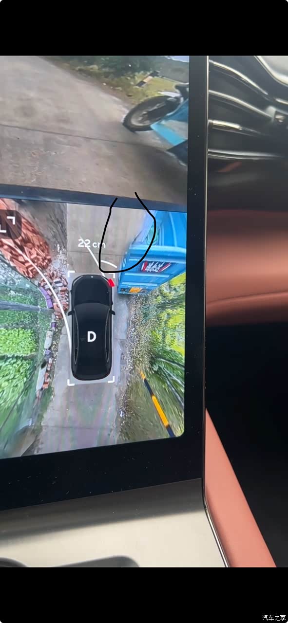 遇到这种情况一定要下车查看,屏幕上没有,雷达探测到了,那就是东西在这段空白里。特别是在狭窄路段和小区里!