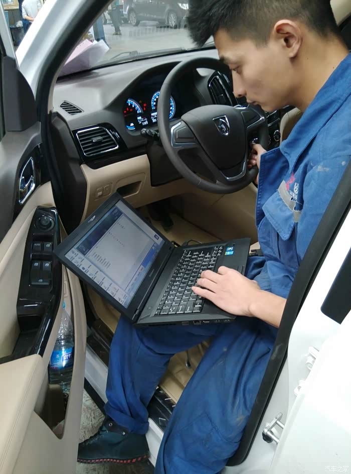 4S店的工作人员在给电脑刷机检测,修正方向跑偏