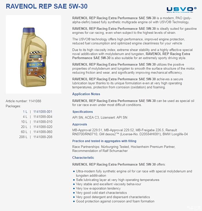 在琢磨这次换什么油呢?雷老板进了raveno的新货后,一直痒痒,看USVO系列,各个参数都不错,还是高PAO加酯的正经全合成,买了9Lravenol的SSL系列的0W40机油,朋友看见眼馋要去了一瓶,询问雷老板得知,ravenol赛油马上上货,要来参数一看,挺不错,要不,就