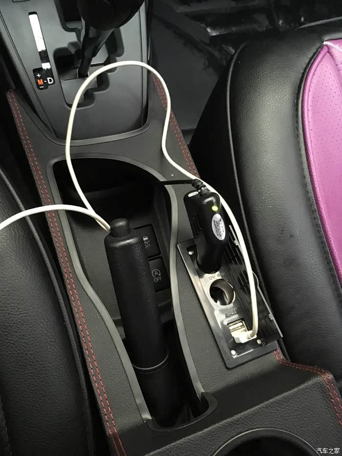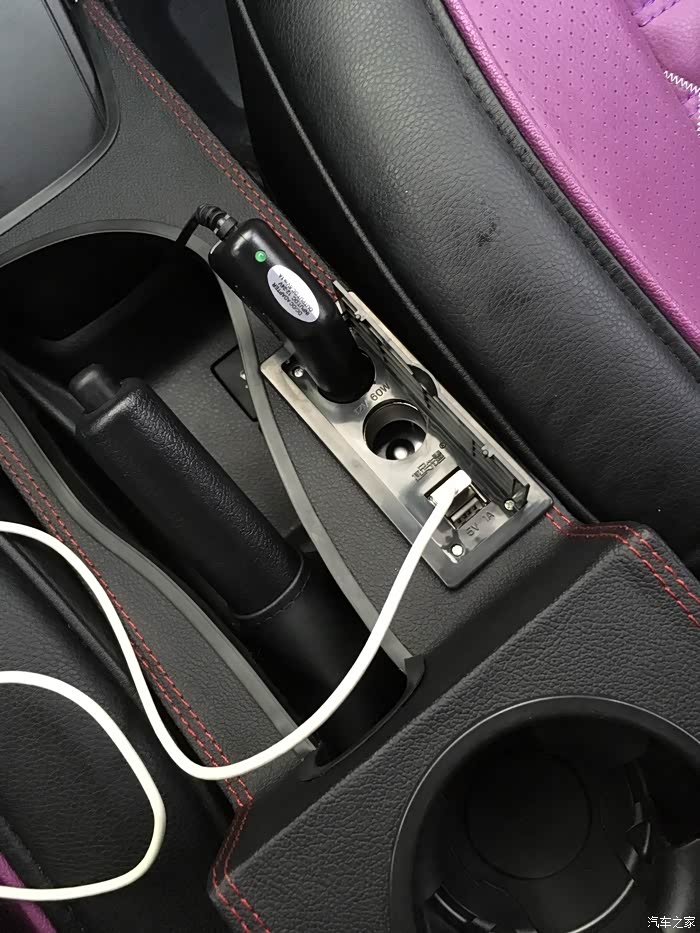 这个豪华通道自带点烟器,直接把点烟器插入点烟口,整个通道就通电啦。我是把行车记录仪的点烟器插到通道上面,然后旁边的两个USB也可以给手机充电,方便至极。