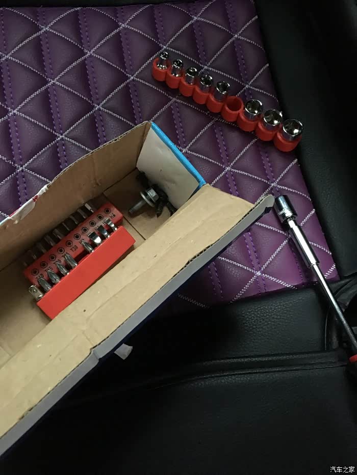 1.原装扶手箱有5个螺丝,4个梅花螺丝,扶手箱左右两侧各两个,扶手箱里面有一个六角螺丝,这个螺丝比较特别,需要用螺丝套筒才能松开。我家是没这个东西,于是我花20块钱在某宝买了。关键词:钢拓外六角套筒螺丝刀。