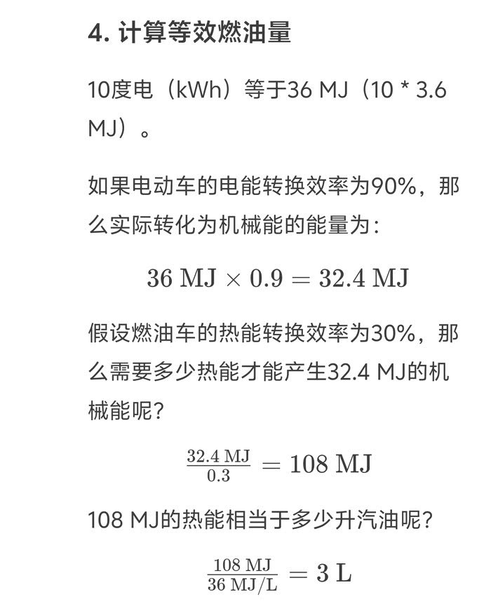 先说说10.4度电大概相当于3升油的问题,不是按照价格算的哈,而是从能量的角度算的