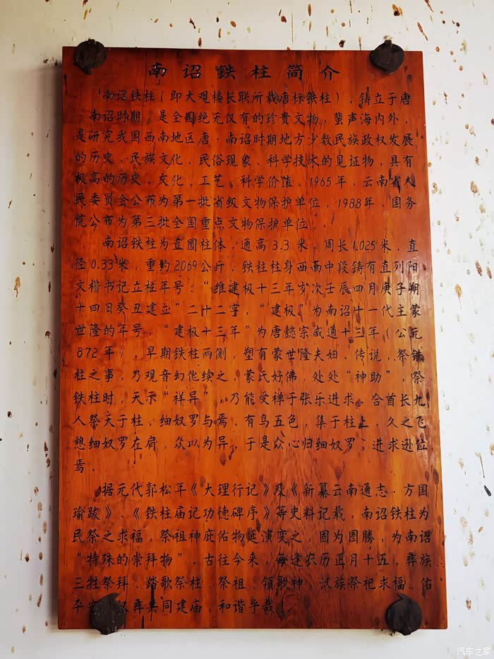 南诏铁柱又称崖川铁柱、建宁铁柱或天尊柱。柱体为圆柱形,黑色,铁质,实心,重约2069公斤,高3.3米,直径32.7厘米,由五段接铸而成。据考证它可能始建于元代以前,这根铁柱历经1000多年从不生锈,至今人们也没弄明白什么原因。更神奇的是,1000多年来它历经了许多次地震,依然挺立如初,这些都像一团迷雾,等大家以后我们去研究,揭开它的秘密。