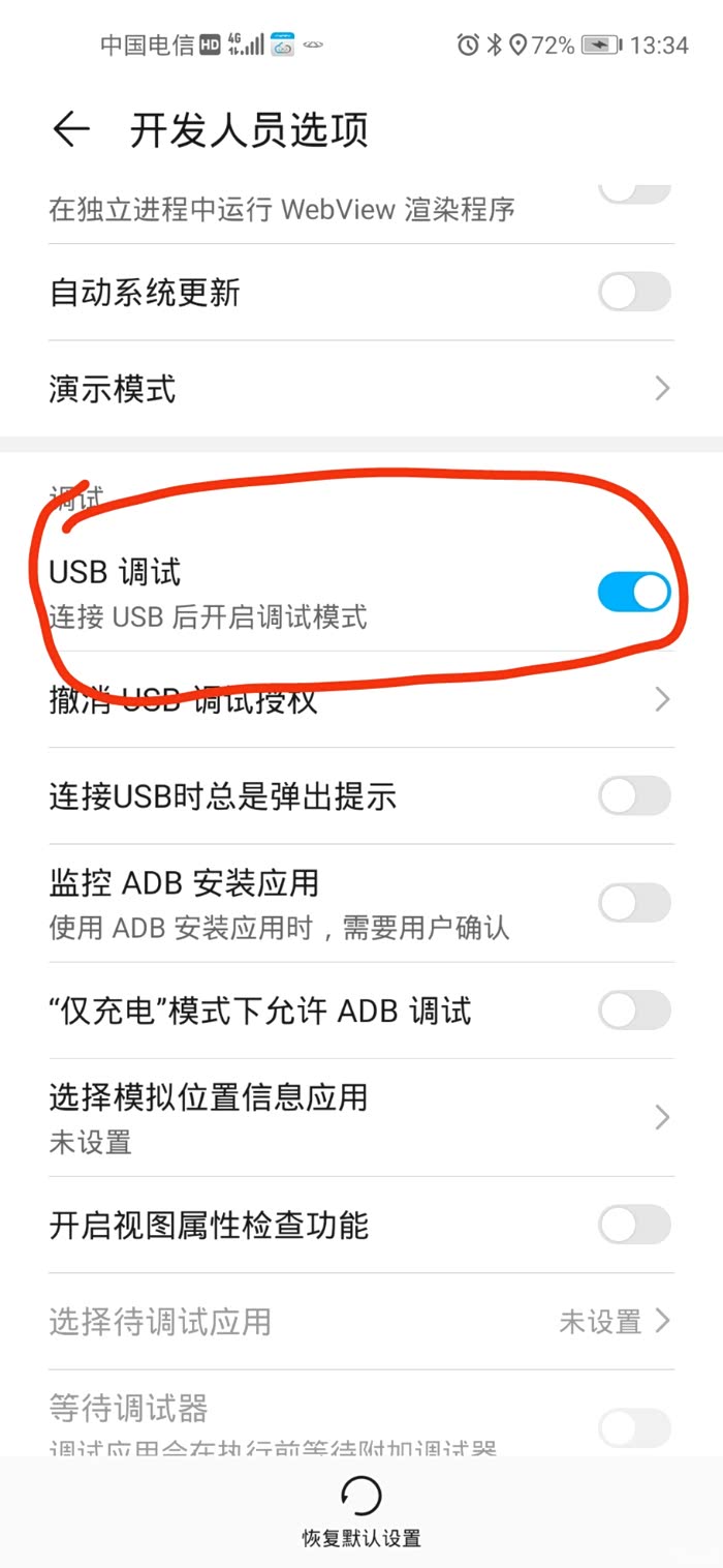连接手机以后,在手机设置里面找到USB调试并打开(关闭得话是无法连接的)