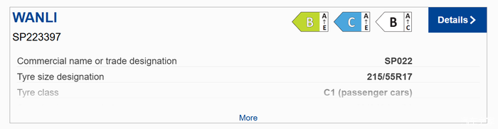 然后线下问了一圈,麒麟系直接没有找到门店,PDD和途虎京东都没有官方店。韩泰H462京东官方店没货,H452又死贵(都清货了还卖得非常贵),因为考虑有试错成本,第一次还是选了一家当地万力线下门店,350一条,换了两个前轮。然后两周后,看到京东大促,281一条又入手换了两条后轮。万力SP022的欧标为BCB,实际上车时带EV的版本,滚阻更低。