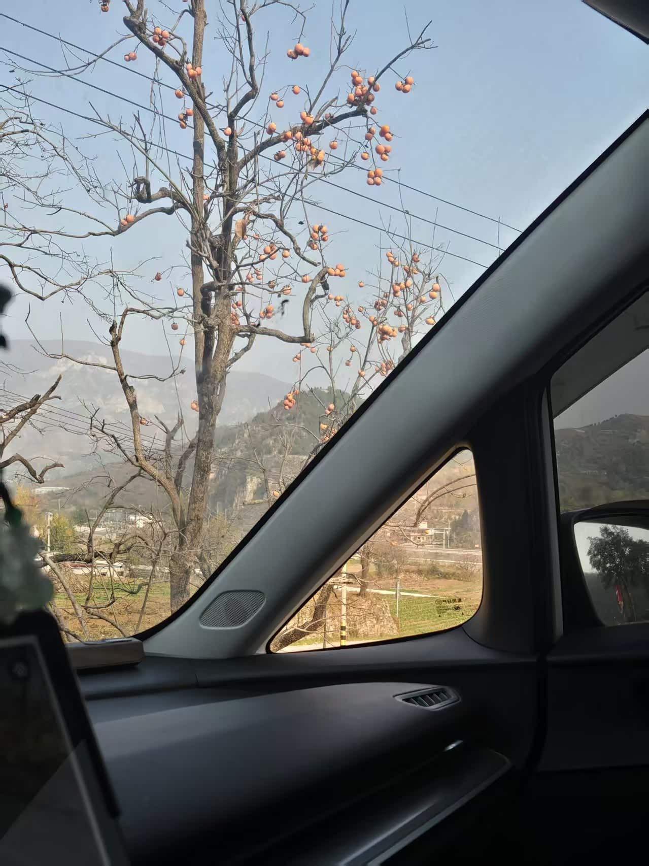 透过车窗就能看到不一样的风景,还有即将要成熟的果实,这里的老乡还特别热情,说树上的柿子随便摘,我们这里太多了这都是不要了的,但是一定得小心。我们也不好意思就欣赏欣赏!