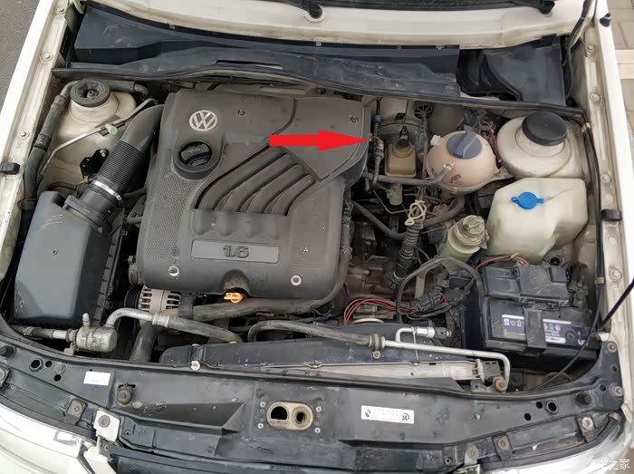 先上一张 发动机仓的全局图(老捷达) 红色箭头位置就是今天的进攻点