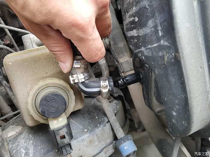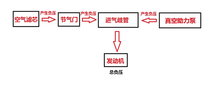 先解释一下进气点的选择 图中可以看出 因为发动机产生负压 所以外部空气从空滤进来 经过节气门 到达进气歧管 再进入到发动机 真空助力泵是需要真空环境的 所以会有一根管子 接到进气歧管上 以产生负压 这根管子比较容易拆卸 所以咱们从这里入手.