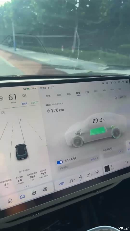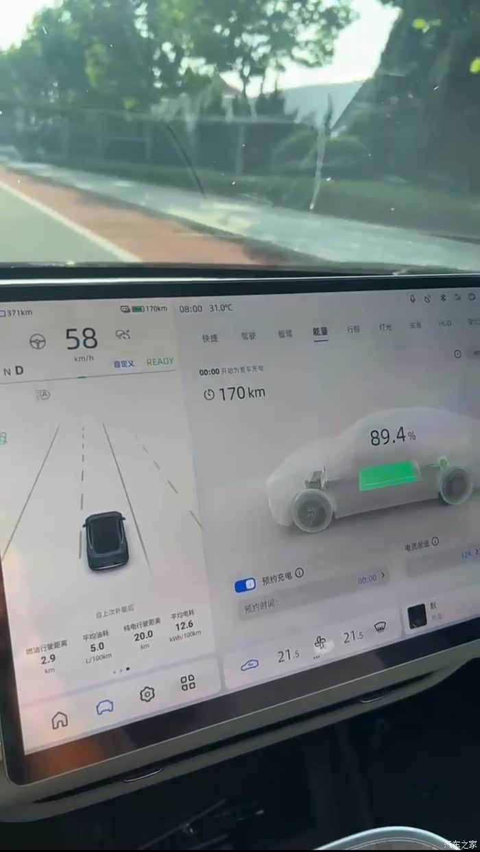上图是我在下坡路段行驶时,车机能量系统显示,车辆正在利用动能回收给电池充电。