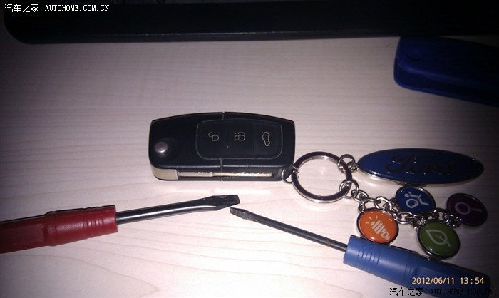 需要两把螺丝刀,小的用来撬开钥匙。大的用来再撬开钥匙,哈哈。小的是撬开第一步,就是把钥匙分成两半,大的是用来把钥匙带按钮的那一半顺着撬成两半,就能看见芯片和电池了。