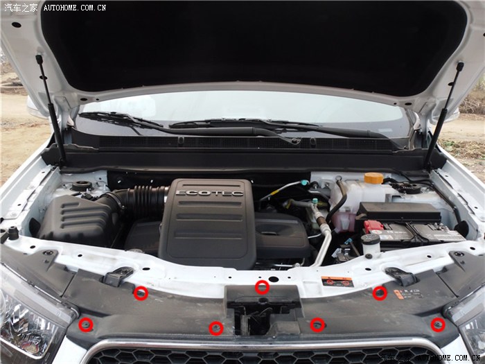 打开引擎盖,大灯总成上面有两块档板,中间有一块大档板,都要取下,中间的档板如下图,有七个塑料螺钉,拧下螺丝之后要把塑料卡子一起拨出来,收好了不能掉。