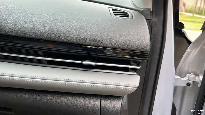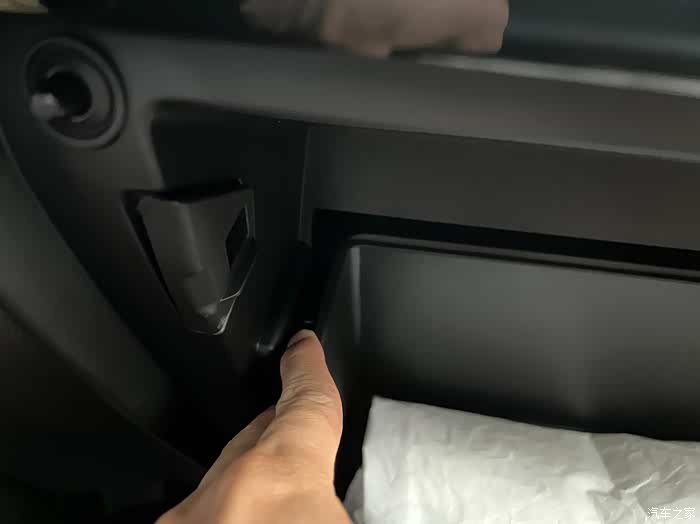 接着我们看到空调滤芯就是在这个位置。这个是一个盖板,捏住小纽扣,把盖板抽出来。