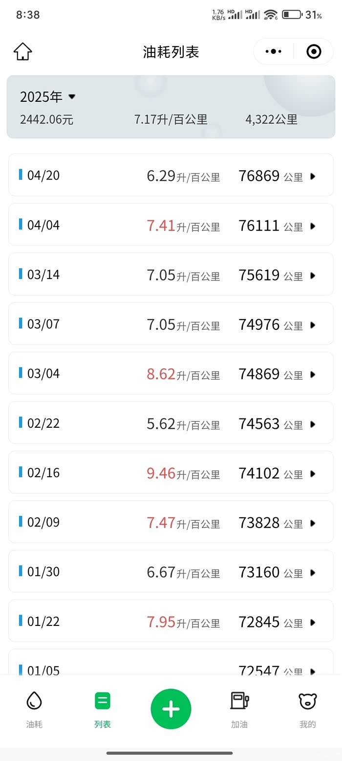 我今年每次加油都有记录走行公里和所加的油量及金额: