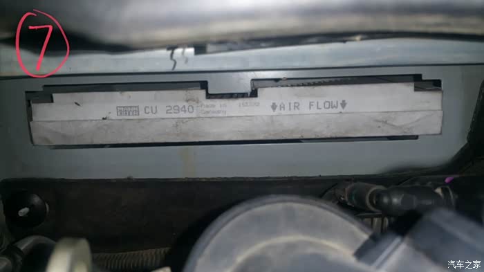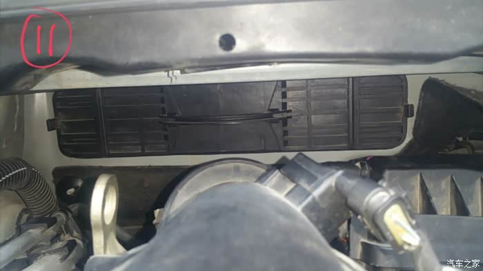 拿开隔音棉后就可以看到里面的空调滤芯仓的盖子,拉中间的拉手就可以把盖子取出来。两边标出的位置为2个卡子,卡隔音棉的