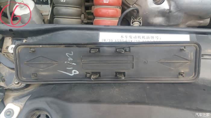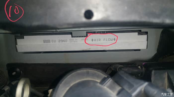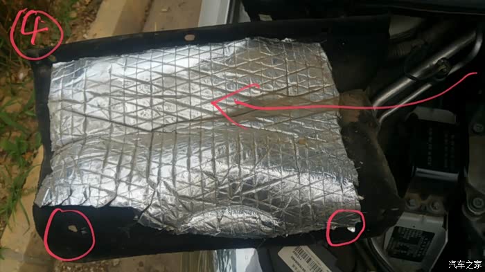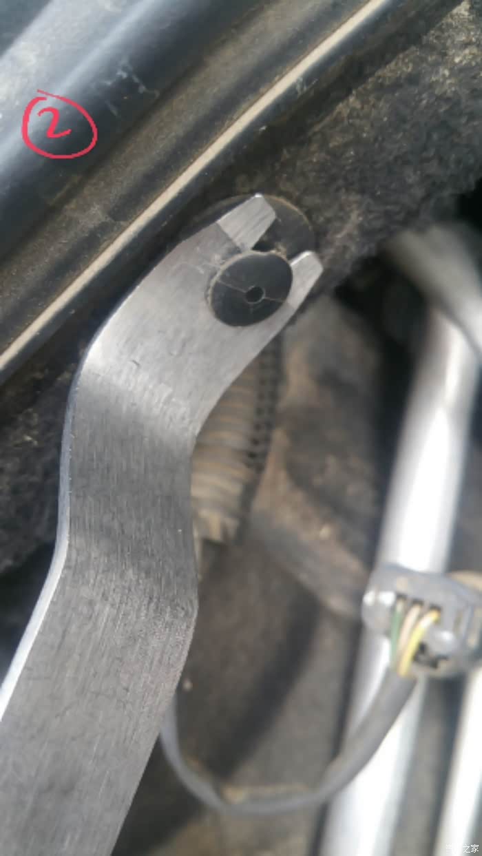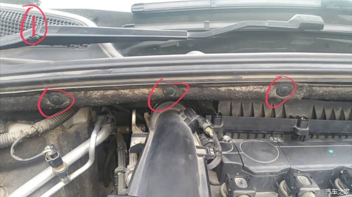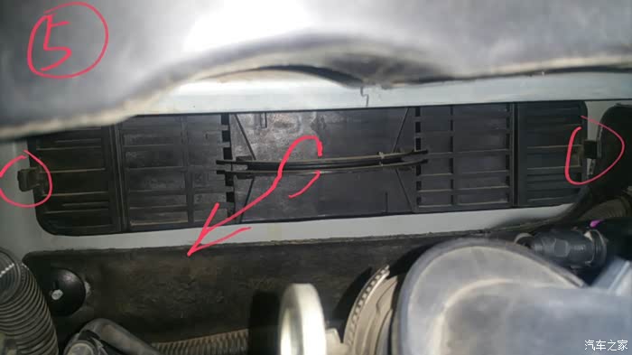 打开发动机仓盖,空调滤芯在副驾座位前面的隔音棉后部,因此换空调滤芯要先拆下这块隔音棉。图中标出了隔音棉需卸掉的3个塑料钉的位置。