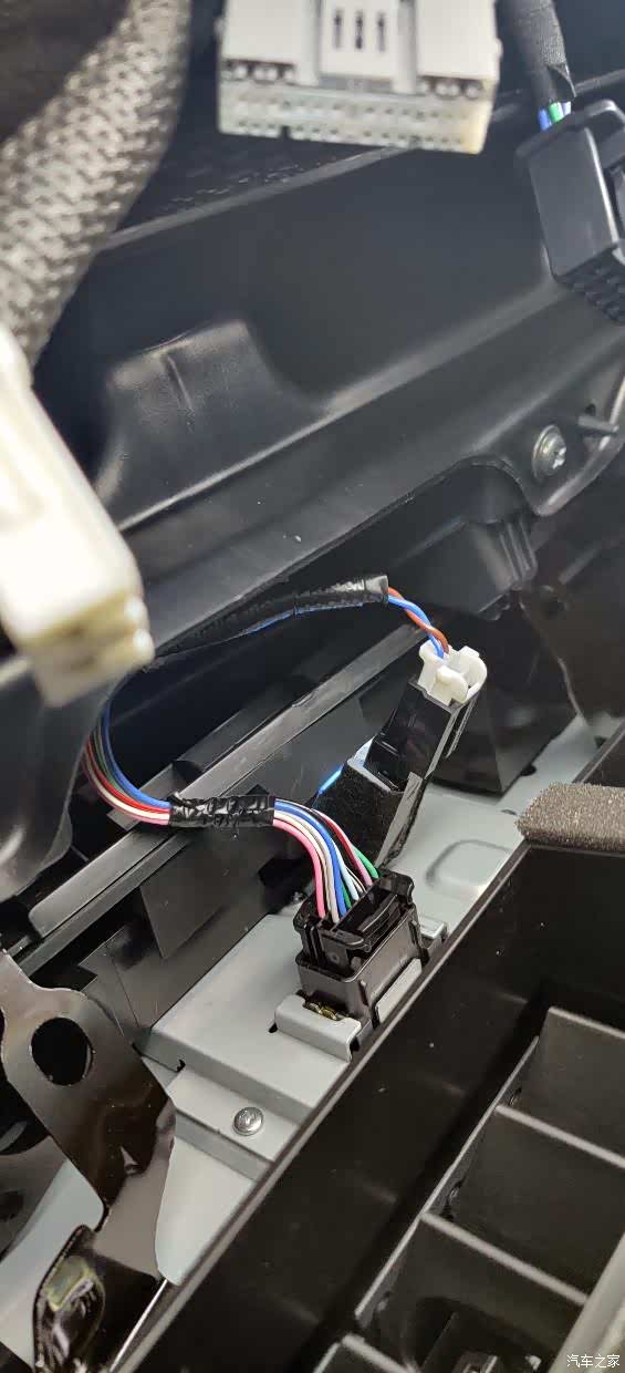 这个插头最容易忘掉的,第一次拆差点就把线扯断。这个位于下面的,空调面板后方的插头,一条是空调控制线路,另一条是氛围灯通电插头。一定要记住拆完后不要急着拔出车机一定全部检查所有线路是否与车机断开。