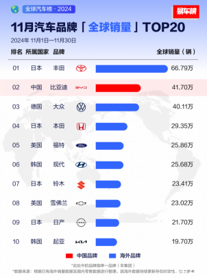 2024年,易车公布的全球汽车品牌销量TOP20榜单中,比亚迪在8月、11月,均斩获了第2名的战绩。