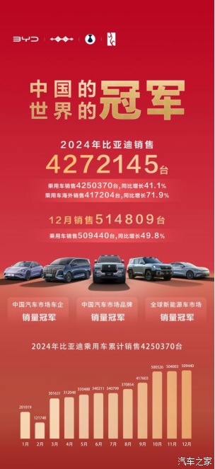 除位列全球十大车企排行榜第五之外,2024年比亚迪还是全球新能源车市场销量冠军、中国汽车市场品牌销量冠军、中国汽车市场车企销量冠军、以及新能源客车出口销量冠军。