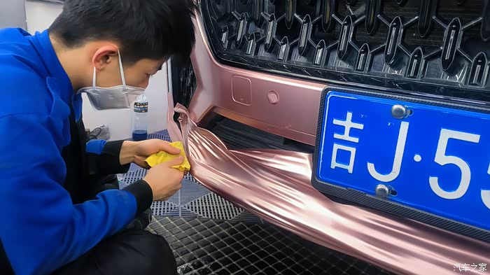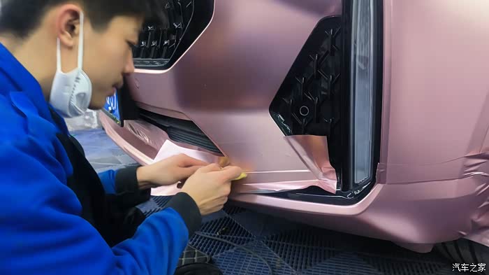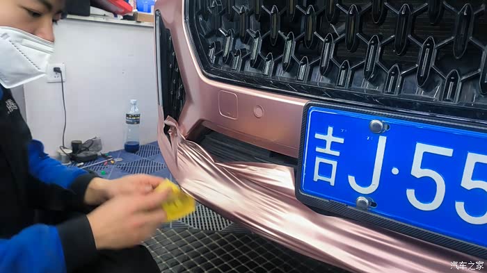 顺序我们先从车头的底部塑料件开始 师傅把改色膜均匀的铺在上面
