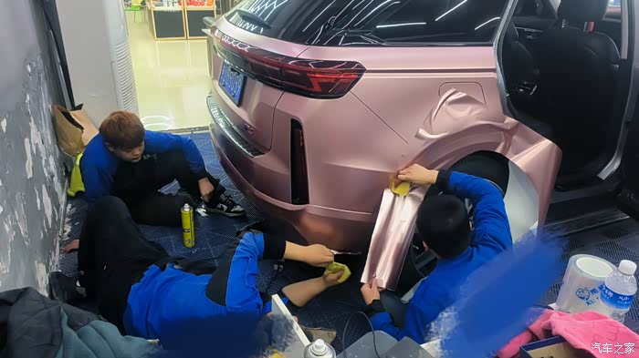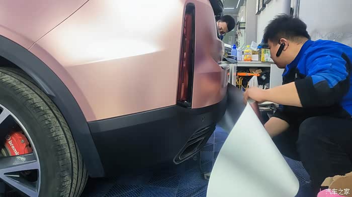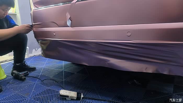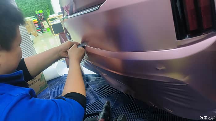 可以看到师傅的塑料刮板已经把改色膜深深的嵌入后保险杠的缝隙里了