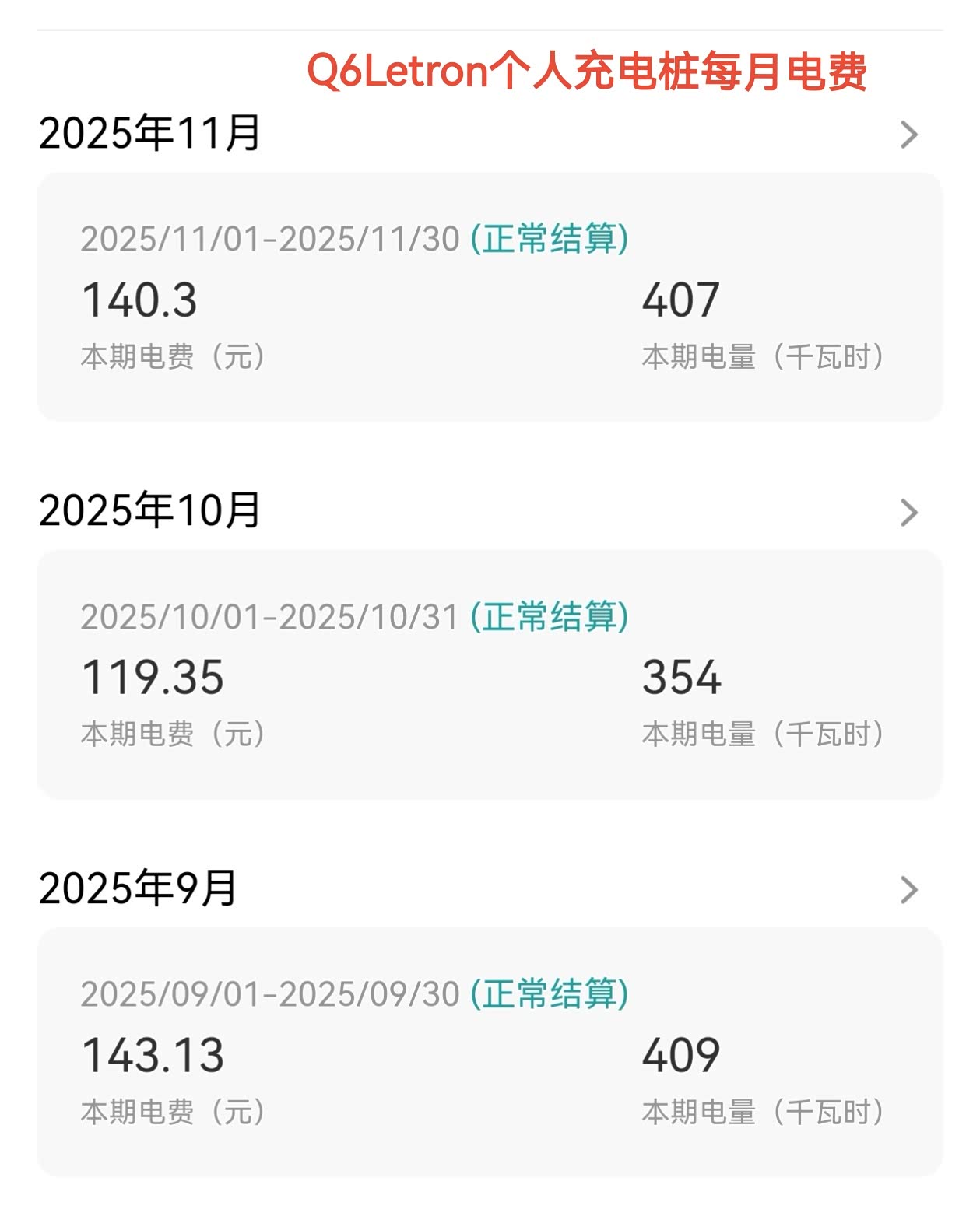 最后分享一下我的Q6Letron用车充电成本。每周大约400公里里程,电量使用区间设置最大80%,差不多每次是30%多冲到80%,一周固定2次充电,充电时间设置为电费谷段时间——晚上22点到次日6点,最近3个月的电费平均值是135元,真的不要太香。