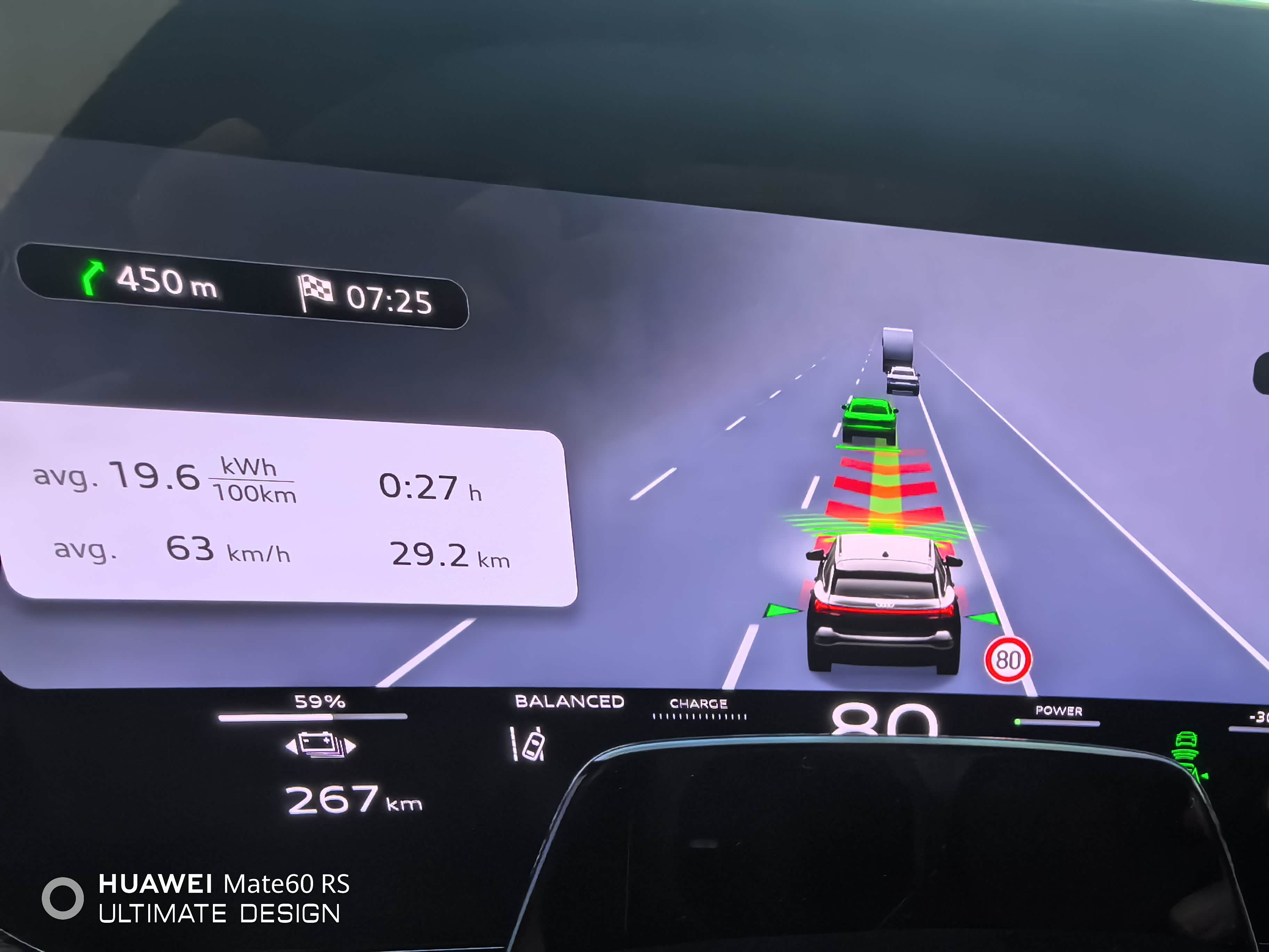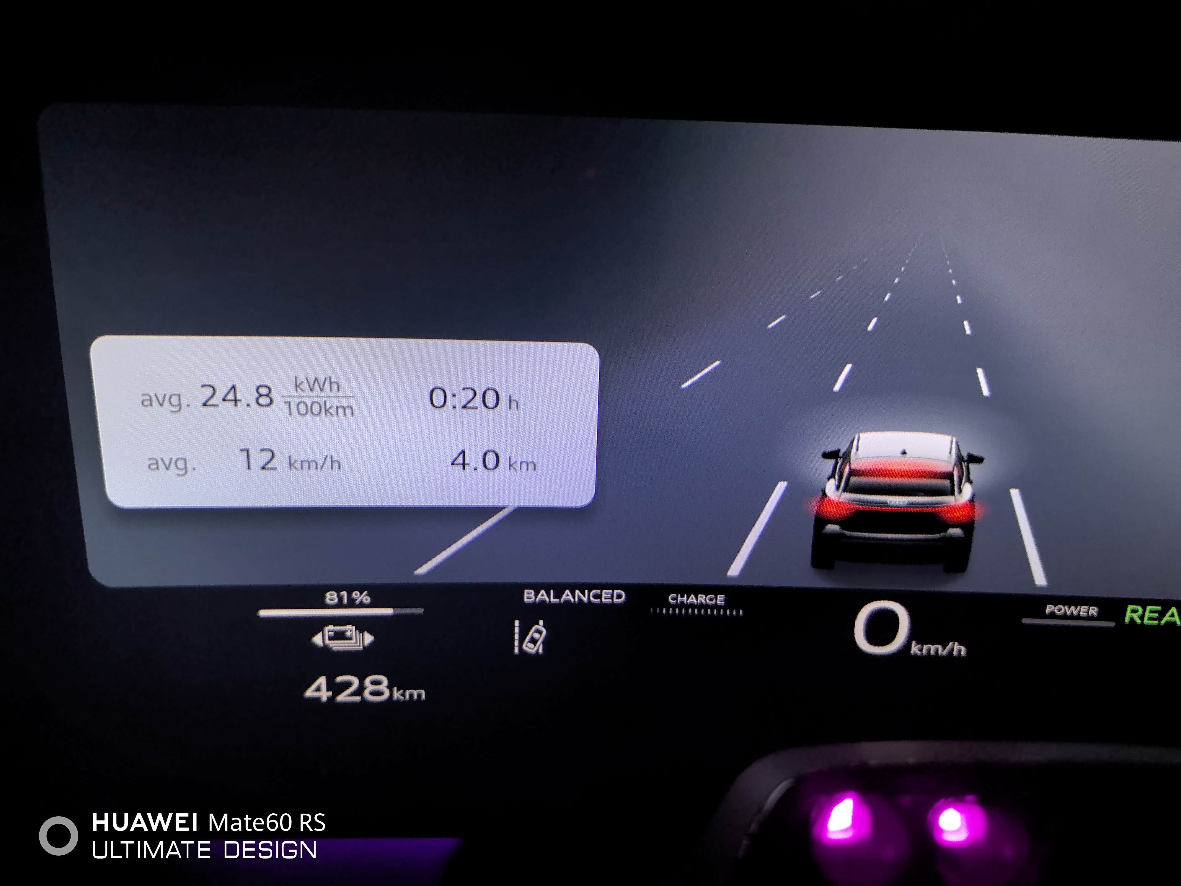 续航表现中规中矩,以我个人为例通勤单程35公里,有城区、城郊和高速,其中高速占比70%,高速段定速105km/h,空调23°,车辆选用的是平衡模式,短期记忆平均电耗基本在17-20,不开空调则下降到17以下。如果没有高速路段,有些车友能开到14以下的电耗甚至更低,事实证明高速路对电车不太友好。目前总里程6200公里,长期记忆平均电耗19.5kWh,充电80%后续航表显在430公里左右,天气温度适宜不开空调的季节续航可以到500+。