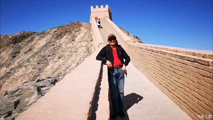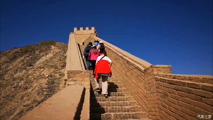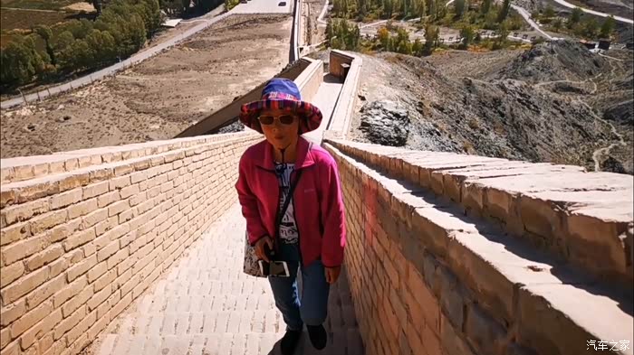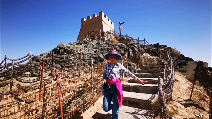 我们沿着山脊城墙的台阶式漫道攀登而上,虽然只有四百多级台阶,抬头仰望,足以令人心生畏惧,踟蹰不前。不到长城非好汉,咬咬牙也得登临悬在山脊上最高处的墩台。我一马当先,夫人殿后。当我们顶着秋天的烈日,冲上烽火台,登高放眼望去,蔚蓝的天空下,关外大漠戈壁的荒凉一览无遗。