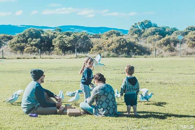 有爱的一家四口在草坪上午餐,时不时的喂鸽子一些面包屑,鸽子会随着小女孩飞舞起来~