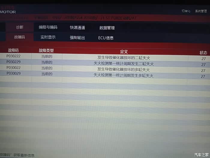 目前行驶不到3万公里,一直加正规中石化加油站油,没有清洗节气门和燃油系统。这几天突然亮发动机故障灯检查排放系统问题。处理方案:首先电脑检测故障码p030222发生导致催化器损坏的2缸失火,P030221,P030229,P030022,P030021等代码,调换1缸和2缸火花塞,2缸和3缸点火线圈,没有解决故障问题,然后直接换了NGK原厂4个火花塞故障码清除试车也正常,等我回家的路上又出现发动机故障灯,又开去检测,依然是p030222故障代码,这次检测4个缸压都正常,调换喷油嘴依然排除不了问题,折腾了半天没有查出来问题,让我下次换箱汽油试试。