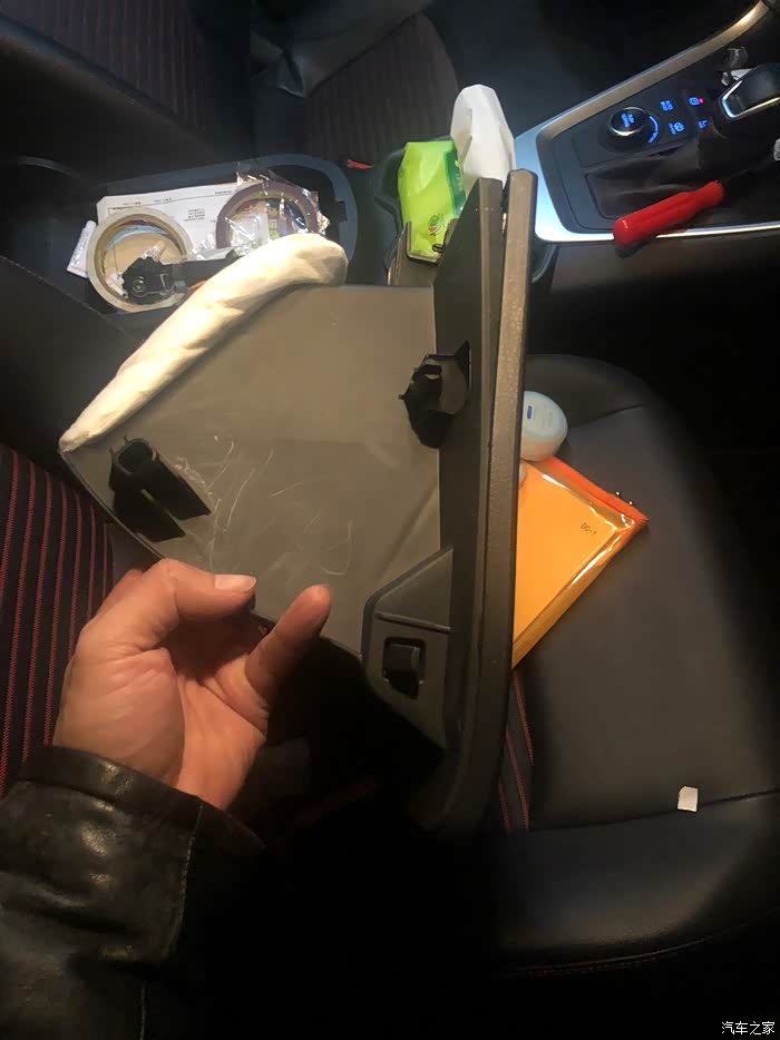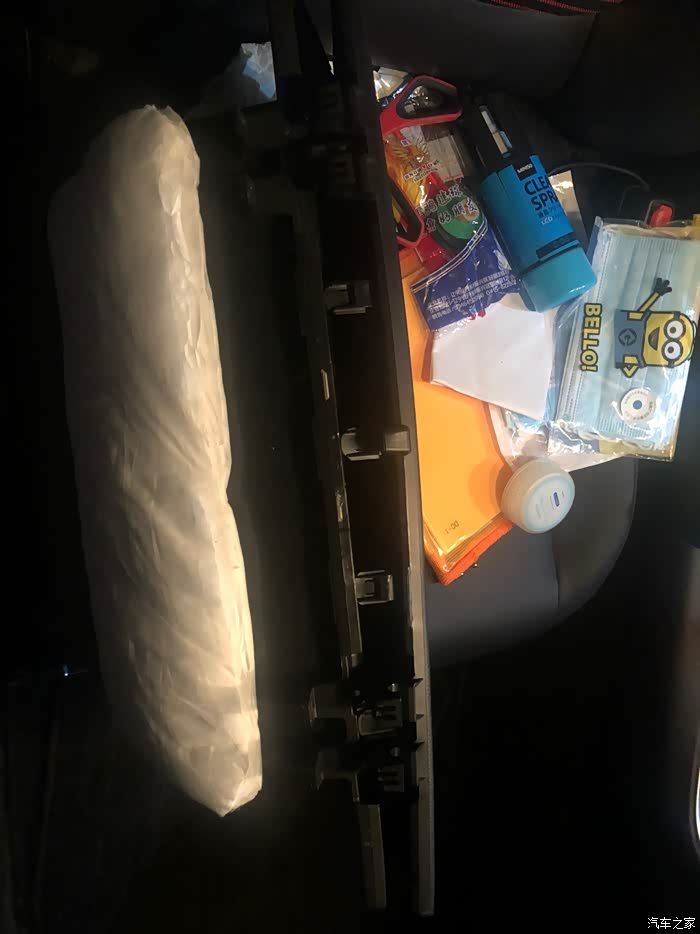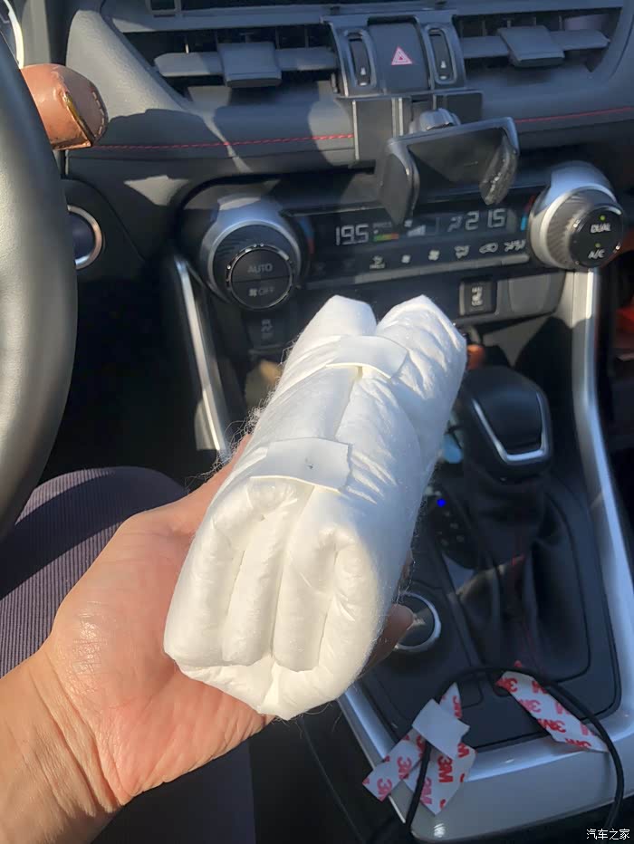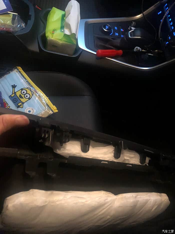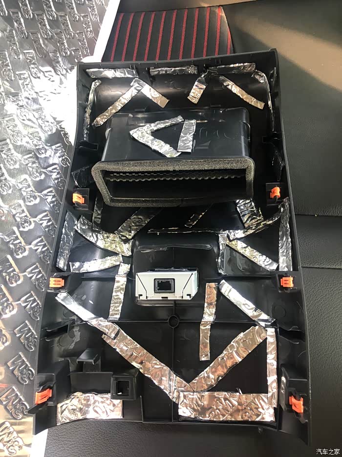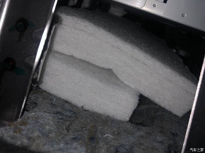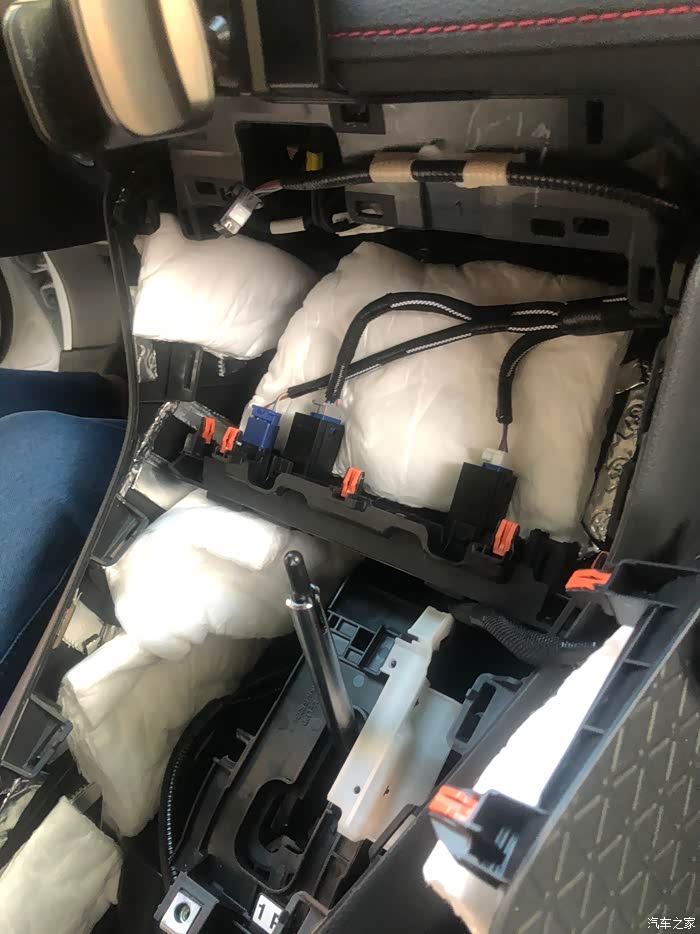 扶手箱这个空间我塞了两条这个吸收低频的棉,没敢弄太满了,上面的360的盒子有一定发热量