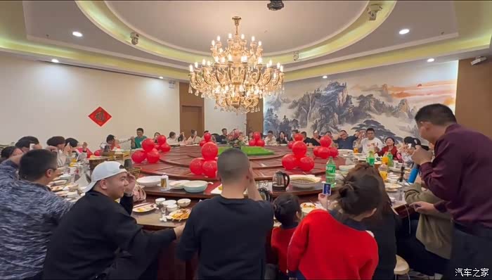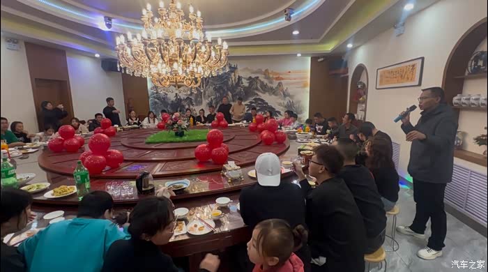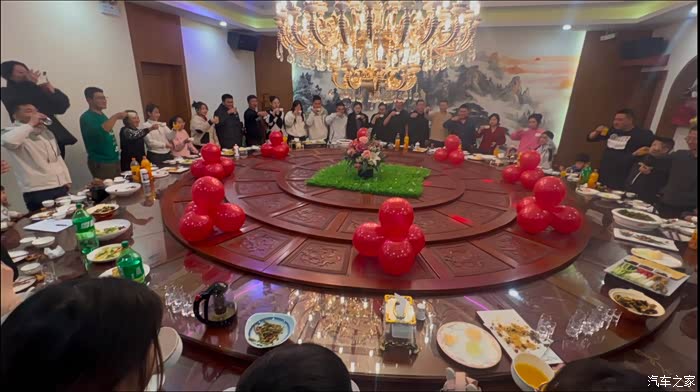 结束玉泉山冰雪世界的游玩,所有车友集合出发前往晚宴饭店。经过二十分钟的驱车,我们到达饭店,宴会厅内装饰着充满节日氛围的彩带和气球。