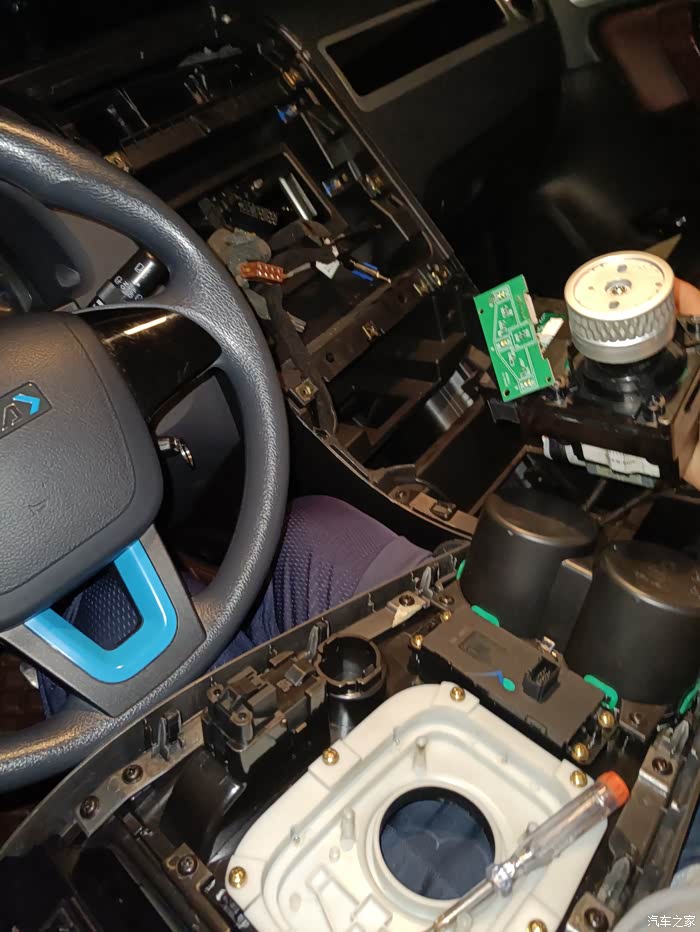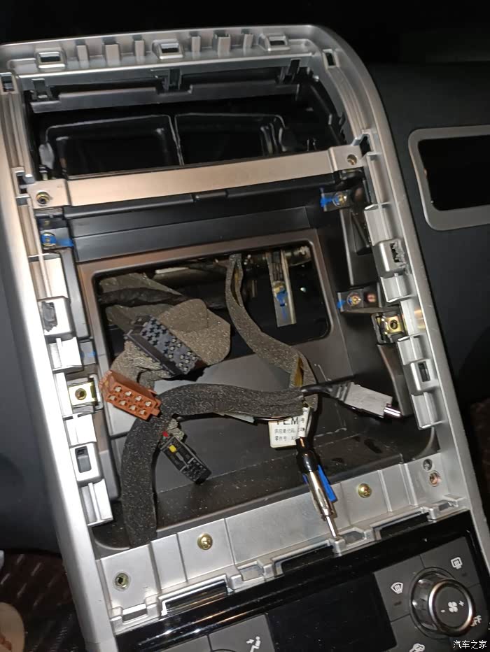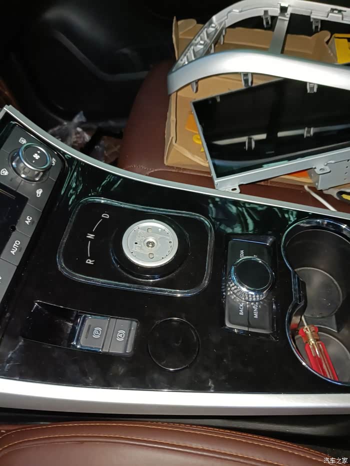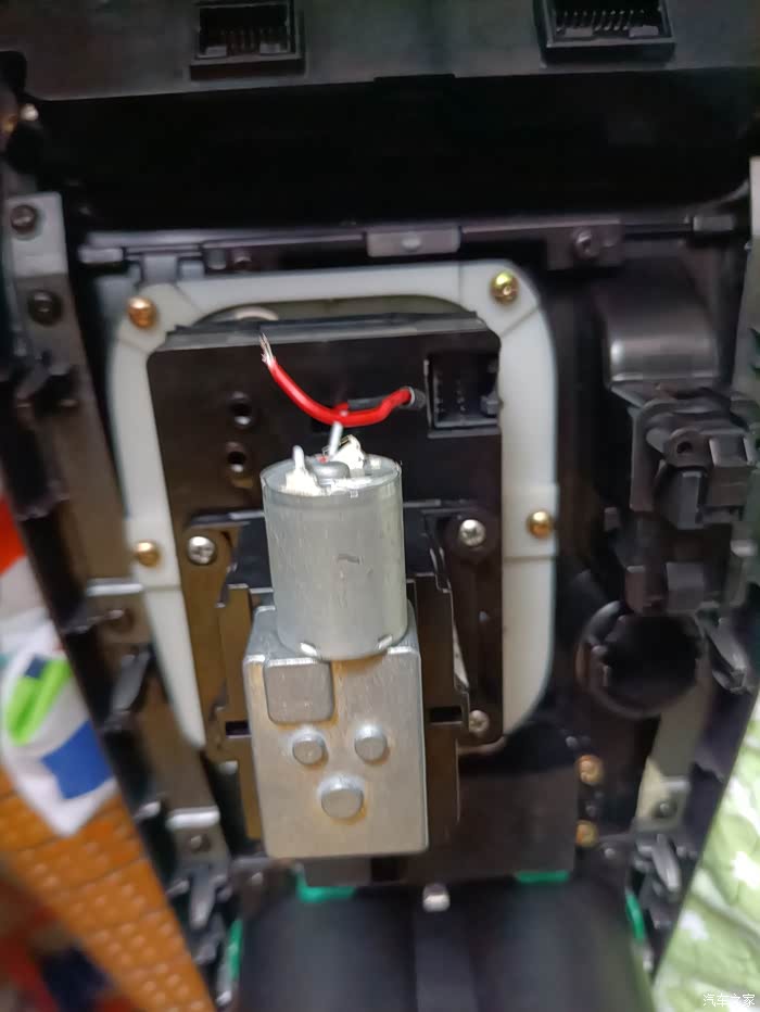 检修屏幕时,顺带拆下了换挡操作台,发现了意外惊喜,由于我买的二手车并不知道低配车型,换挡旋钮是可以升降的,结果看到升降电机人为断线包扎(图后配的),为了测试能否正常使用我把线接上进行了测试,结果测试正常没任何其它短路卡顿问题