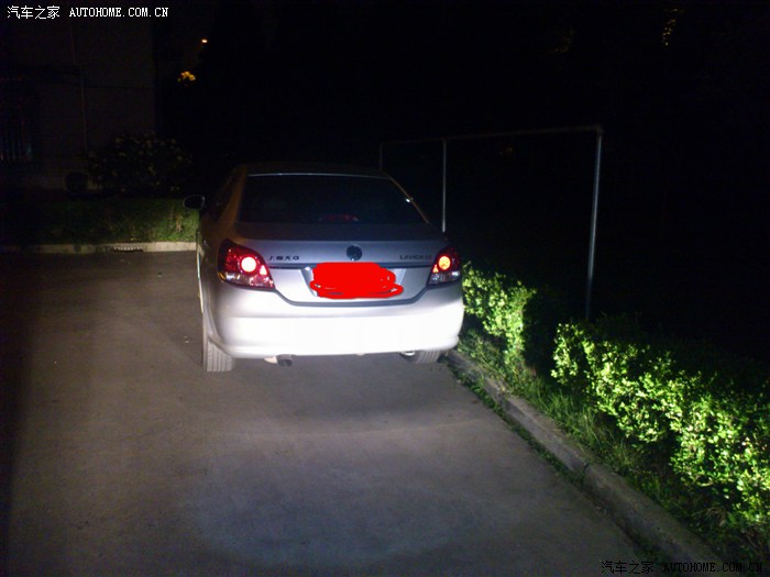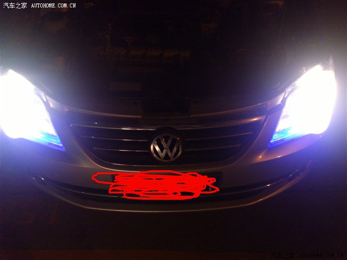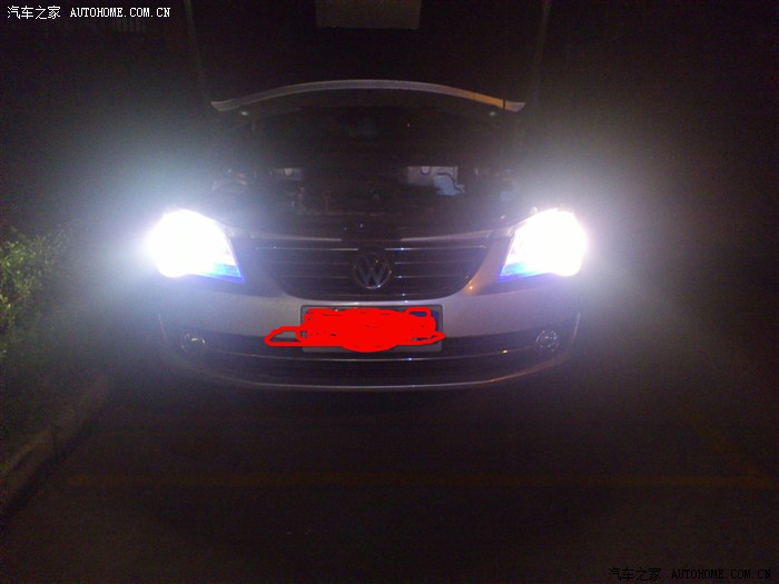 照到前面的车屁股了,看到左边的原装颜色比较黄,右边的夜行者二代颜色发白。地上的蓝光圈是我的手电筒照的。。