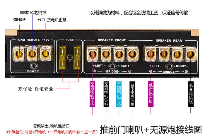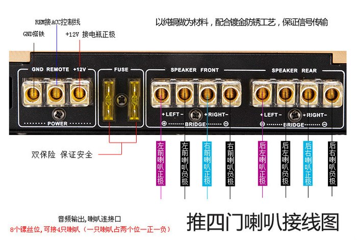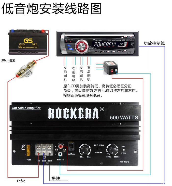 2、功放12V属于电源正极,直接拉线至电瓶的正极,安装保险胆。