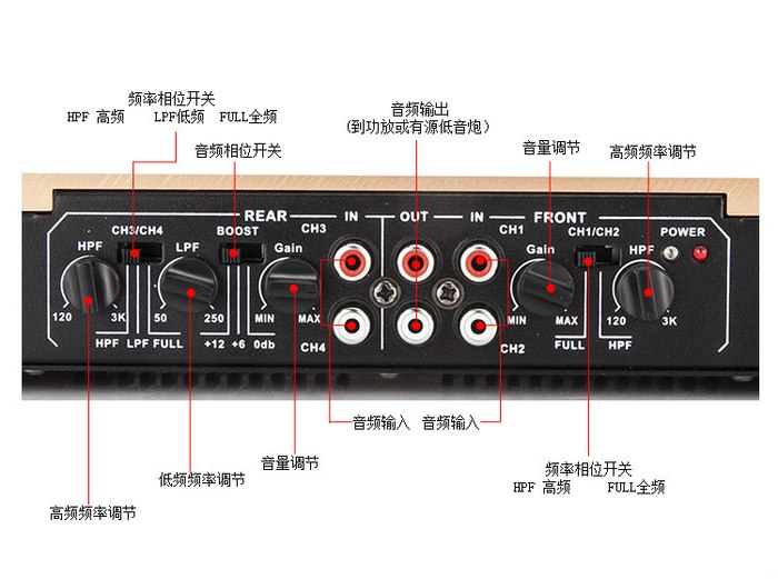 7,低频、全频转换开关,低音炮,功放均支持纯低频功能,低频功能是专业演奏中的低音效果,没有低音的歌曲,低音炮在纯低频的工作状态下,低音炮的音量会很小,甚至会没有音乐,在全频状态下,低音炮播放音乐是保守工作的,一般我们建议用纯低频功能,这样可以发挥出低音炮在演奏低音是最好的效果!!!