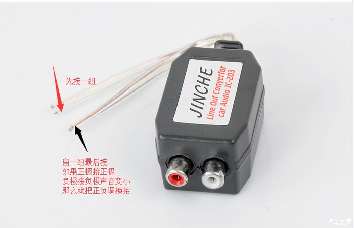 请先接高转低的一边线,其它线都接好之后,插上两个音频线,打开电源,播放音乐,在接另外一组线,如果接时上发现低音炮声音变小了,那么把这没接的一组调换正负极接,(通常黄色接喇叭线正极,银色线接喇叭线负极)(反过来把银色接喇叭线正极,黄色接喇叭线的正极)就可以了。