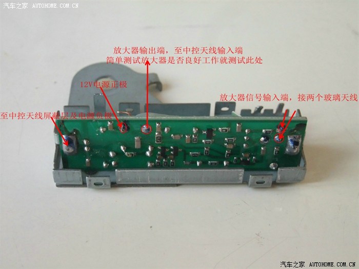 我用手指头轻轻接触一下天线放大器输出的位置,发现收音机的声音有明显的改善,然后我又用万用表测量了一下电源输入的电压:11V,接近12V的要求,说明电源没有问题,那可能是收音机天线放大器有问题了,OK!知道问题就好办,合上后盖板,开车到SSSS店问了一下,我*,就这么一个小小的电路板,SSSS要我1000大元,你穷疯了你,抢钱啊!开车直奔电子市场,找到我朋友那里提出我的需求,需要一个电压12V的收音机天线放大器。朋友告诉我他找到后通知我,让我先回去。等了两天,朋友打电话说找到了,让我去拿,我去以后,朋友拿出一个小小的电路板,看上去做工很精致,用料也很足。拿上放大器后,等到清明长假,我利索的把放大器换上去,怀着忐忑的心情拧车钥匙给电,开收音机......,耳朵里立刻传来兹啦兹啦的杂音,哦,是我忘记调台了,首先调到974交通广播,哇!CD的音质啊!此刻交通台正在放音乐,一首汪峰什么歌缓缓响起,非常清晰饱满,没有一点杂音。我敢说绝对不比任何收音机差,又搜索了一下电台,只要我听说过的电台一个都不少。开着车又出去转了一圈,很好,音质几乎不变。至此,我收音机的问题全部解决,装车图就懒得拍照片了。