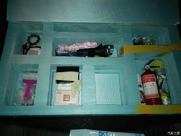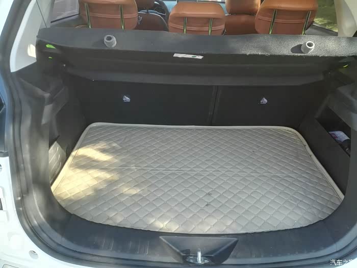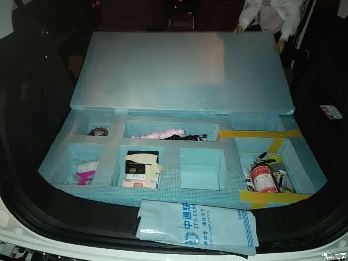 这个挤塑板比后备箱要窄一点,把挤塑板推到最里,车尾处还会有一点点空隙,正好放下了我的蜡拖和一把小铁锹(没拍照)而且刚好挤住,一点异响都没有,盖上后备箱垫子,完美