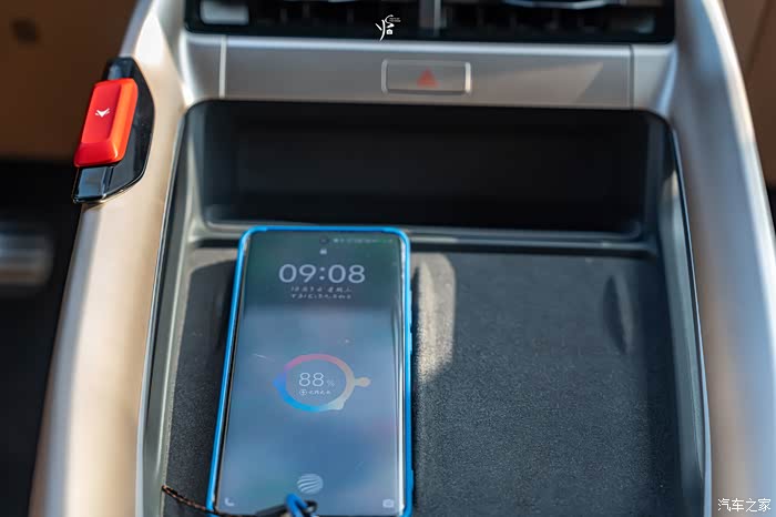 在这里无论是车辆的座椅,空调,车灯等都集成在这个中控屏里面操作,当然车里还配备了50W的无线快充,并且为了防止手机过热,这里还设置有出风口给手机降温