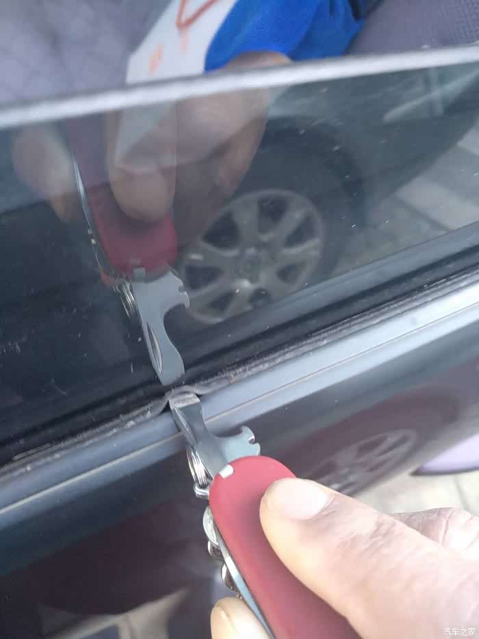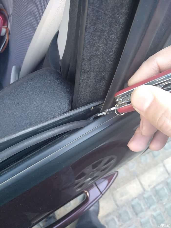 先从前门玻璃开始,因为前玻璃降到最低时有一侧的玻璃是下到门里面的,比较方便操作。塞密封管之前要先做两项准备工作: