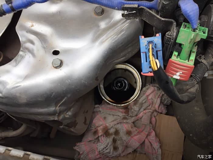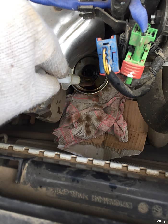 在下方垫上抹布,防止机滤里油漏下去,用针管把机滤里的废油抽走,让别人保养可不会这么给你干