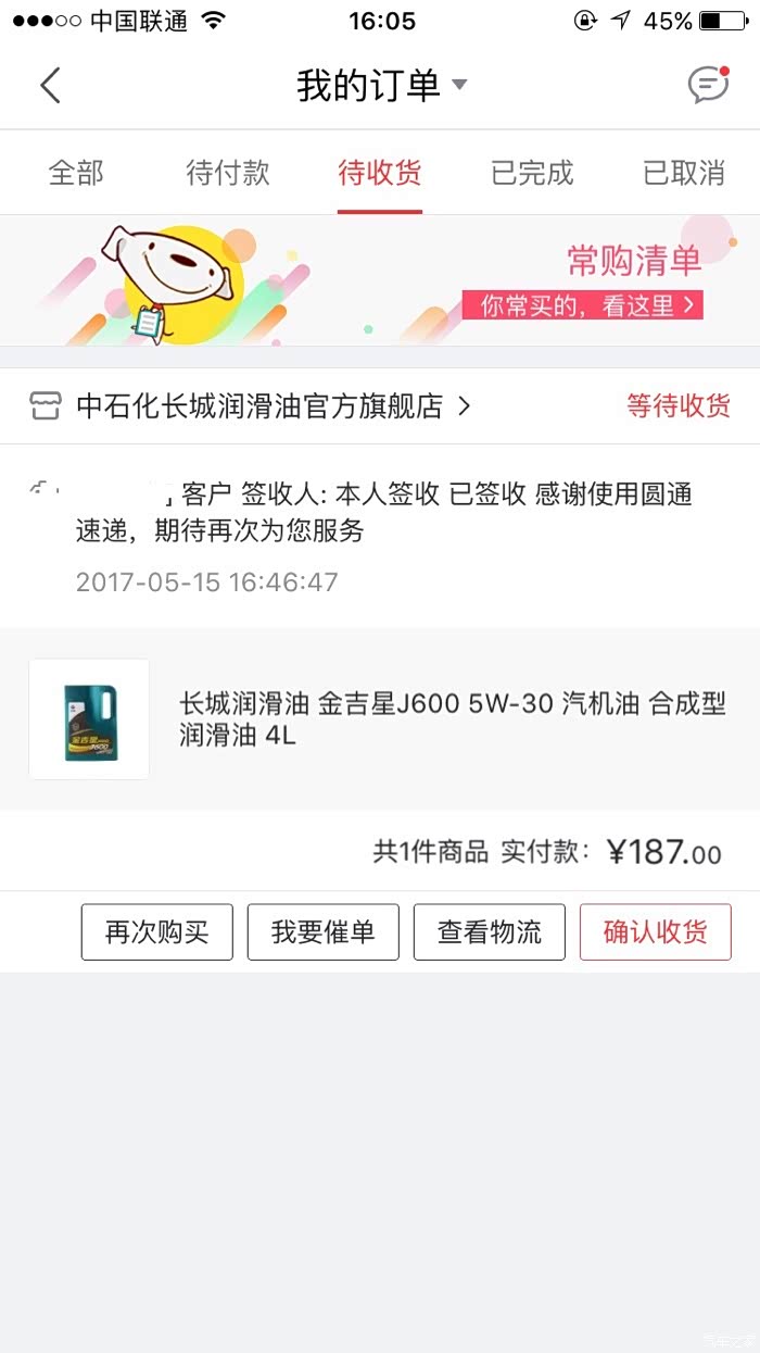 有朋友推荐从中石化加油站买长城金吉星,自己家的门店肯定是真机油。。。。。但是由于自己没有时间去,就上长城润滑油官方网站看了看,上面直接有京东和天猫旗舰店的链接,后来打长城人工电话,也证实了确实是官方的店,这下就放心买了。188元买了金吉星J600,半合成机油,送博世机滤,也挺合适的,包装挺好,查了一下防伪,说是正品,第二次查就说某某时间还号码也被验证过(只能说应该是真的)。上图
