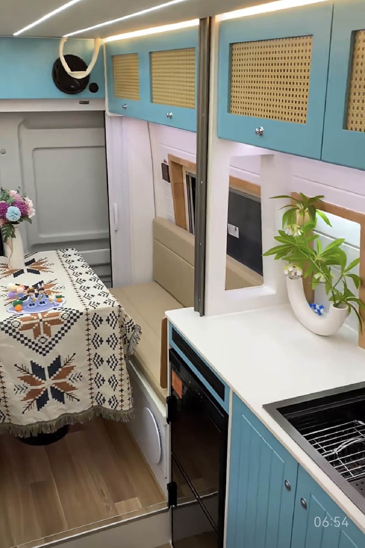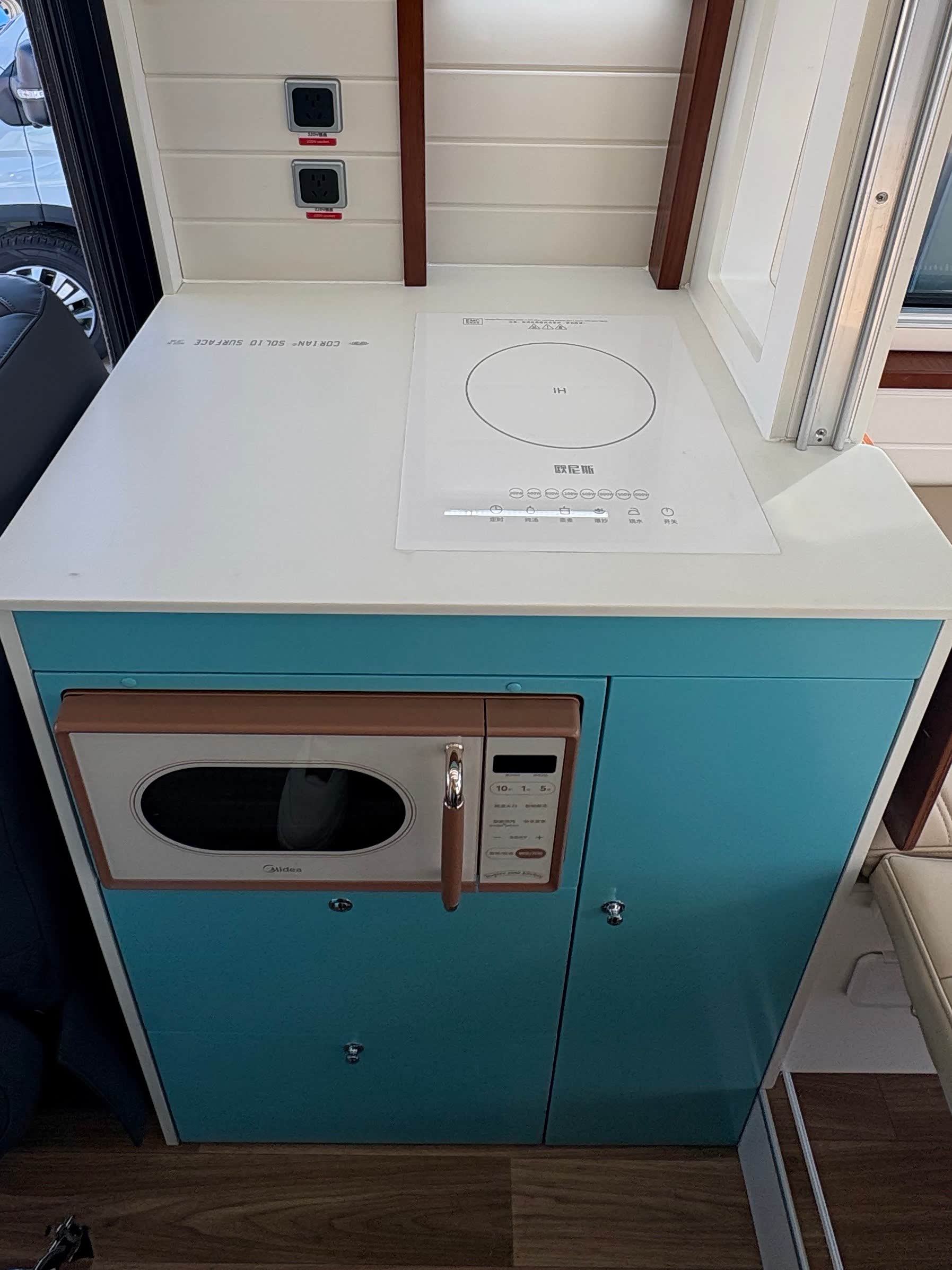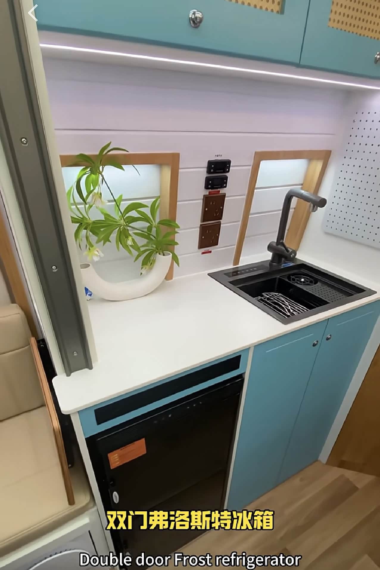 卫生间靠前,后面左右两边为厨房区域,让整个车内全景通透。也让厨房部位更加宽敞舒适。