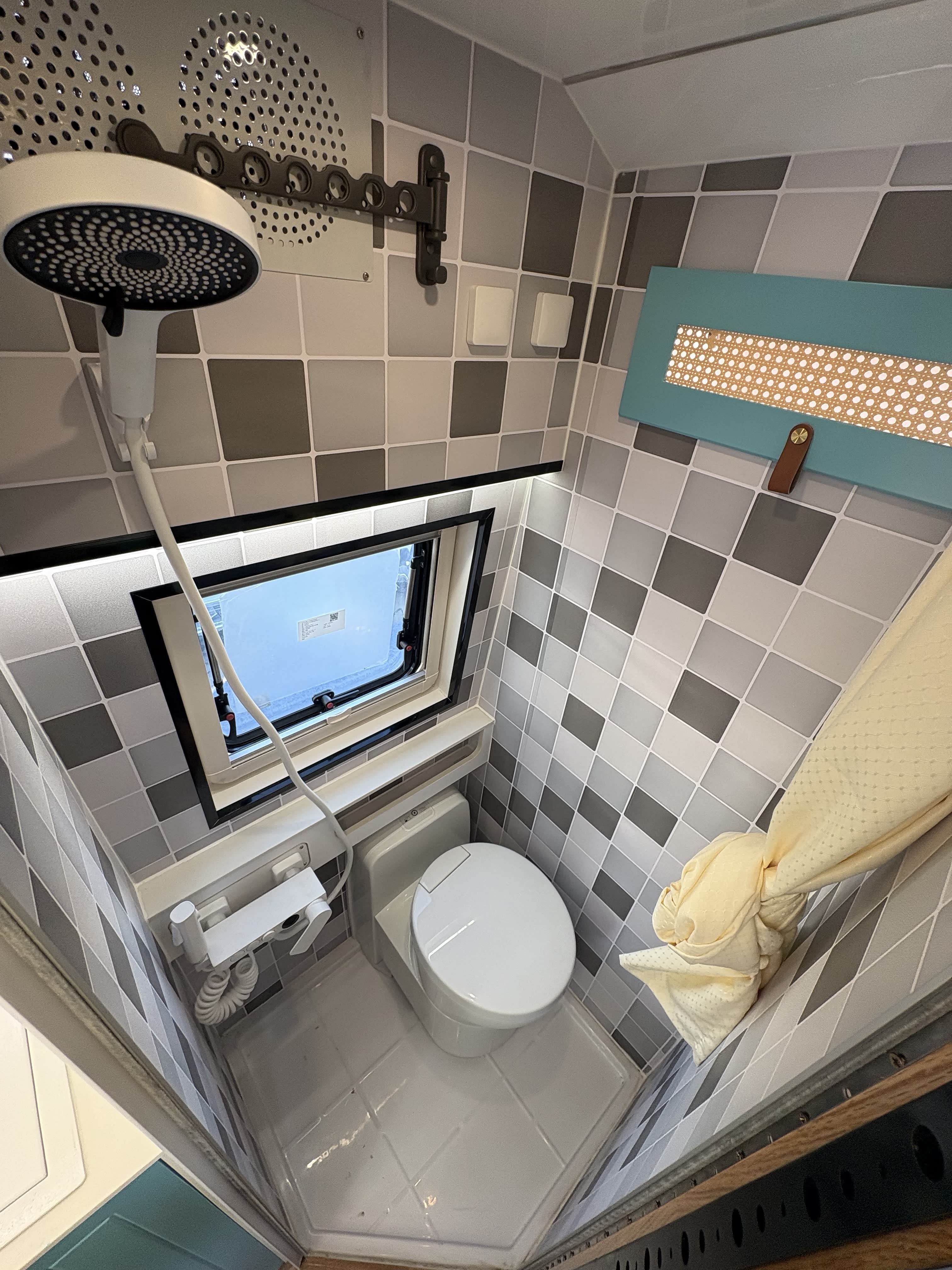 卫生间内部双头淋雨花洒带温控显示,侧面开窗换气,舒适旋转晾衣挂钩,带照明功能沐浴装备储物盒,空间和功能利用到极致。马桶还可以选装生物降解马桶。