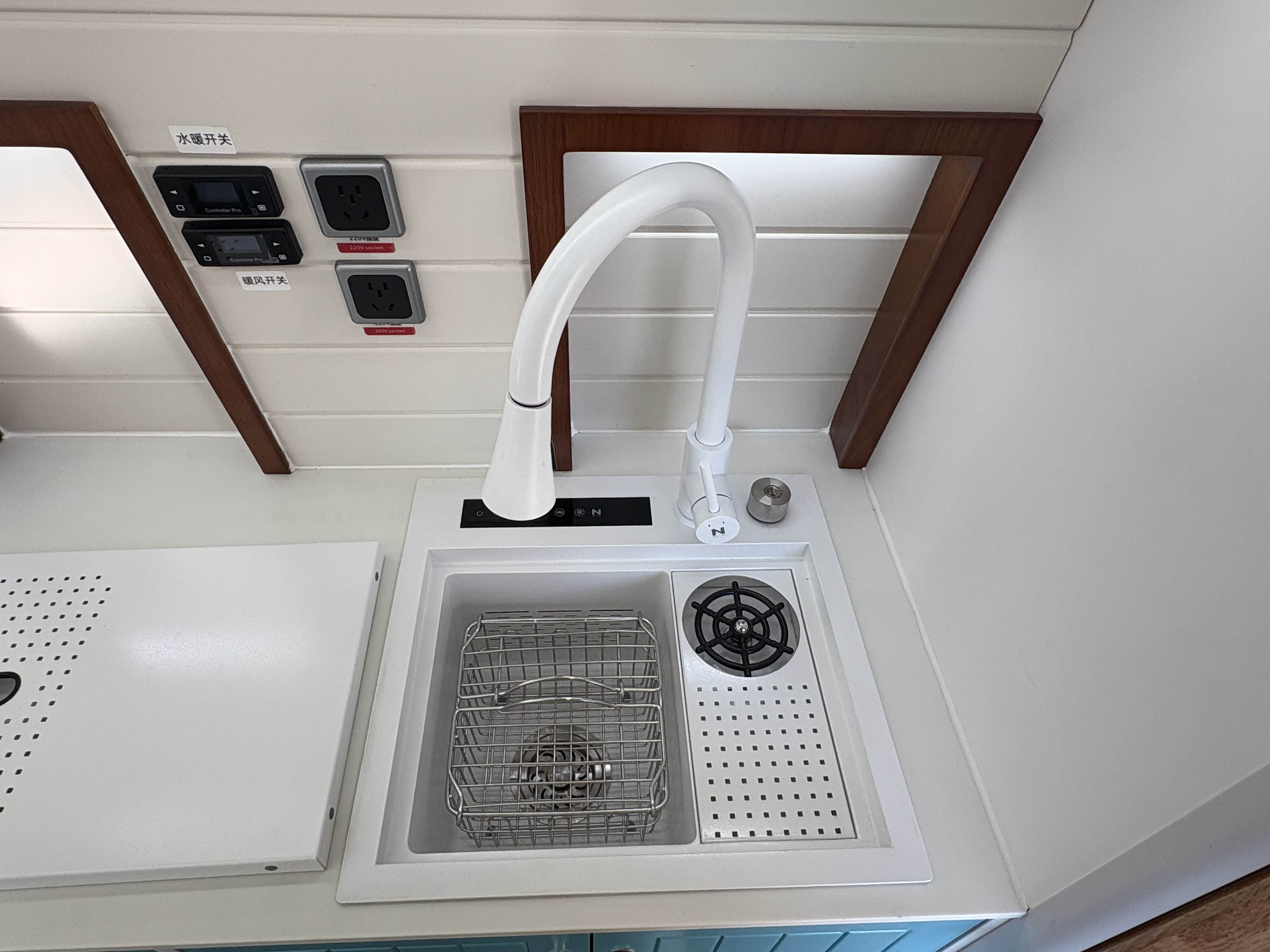 洗菜池是亮点,获得德国红点设计大奖,有双出酶果蔬消毒功能,即热出水,还有水杯冲洗功能,中间配置一个提篮,完全满足一个女性车友家的感觉。